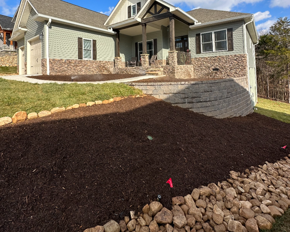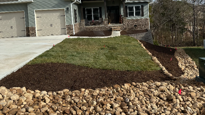 - Spreading 30 tons of decorative river stone for drainage control and design continuity