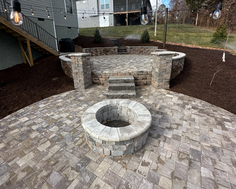 This custom outdoor living space in Kahite, Tennessee, showcases expert craftsmanship, detailed design, and durable materials throughout. The homeowners wanted to transform their sloped backyard into a usable, inviting retreat that felt both functional and elegant. Our team at Property Docktors designed and built a two-tier outdoor area with a Belgard paver patio, custom fire pit, and structural retaining walls, seamlessly blending engineering precision with natural beauty.